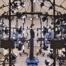 It’s a view that came in handy as Cave planned his first public sculpture, newly installed at the Frederik Meijer Gardens and Sculpture Park in Grand Rapids, Michigan. The bronze, titled Amalgam (Origin), is modeled on his own body, its skin textured with vegetation and its head replaced with a growth of bare branches occupied by birds. The artist had originally intended for the statue to stand 15 feet tall, but working with V.R. forced him to rethink scale: “This is not big enough,” he thought. The sculpture was raised to 26 feet, the same height as Amalgam (Inflate).
